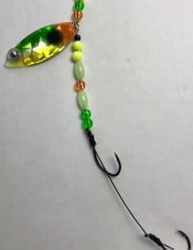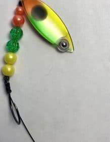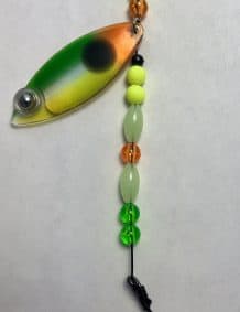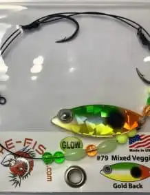 $5.99Quick ViewThis weighted colorado single-blade harness lure is colored on the front with our Eye-Fish Mixed Veggie design with gold color on the backside, connected with a folded clevis to a wireline featuring green, orange, gold, and glow beads.