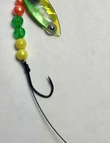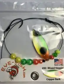 $5.99Quick ViewThis weighted colorado single-blade harness lure is colored on the front with our Eye-Fish Mixed Veggie design with crushed silver color on the backside, connected with a folded clevis to a wireline featuring orange, yellow, and green beads.