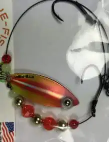 $5.99Quick ViewThis weighted willow Double blade harness is colored on the front with our Eye-Fish Sunset design with silver holographic shattered glass on the back side and connected with a folded clevis to SS nylon coated wire line featuring red, gold, orange beads.