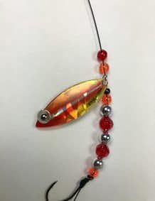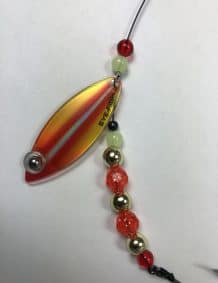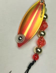 $5.99Quick ViewThis weighted willow single blade harness lure is colored on the front with our Eye-Fish Sunset design with copper color on the back side and connected with a folded clevis to SS nylon coated wire line featuring red, gold, orange and glow beads.