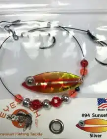 $5.99Quick ViewThis weighted willow Single blade harness is colored on the front with our Eye-Fish Sunset design with holographic copper on the back side and connected with a folded clevis to SS nylon coated wire line featuring red, gold, orange and glow beads.