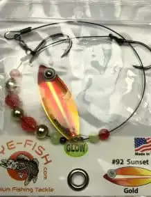 $5.99Quick ViewThis weighted willow single blade harness lure is colored on the front with our Eye-Fish Sunset design with Gold color on the back side and connected with a folded clevis to SS nylon coated wire line featuring red, gold, orange and glow beads.