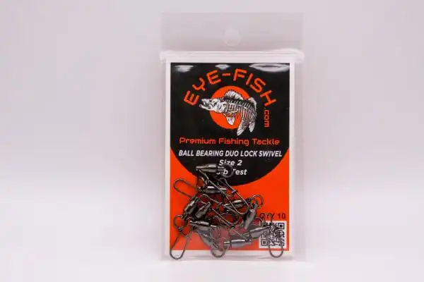 These ball bearing swivels have duo lock snaps built with super strong stainless steel wire that has excellent elasticity maximizing break strength and flexibility. The stainless ring is welded and the internal stainless bearings deliver ultra smooth rotation eliminating line twist. These ball bearing duo lock swivels are size 2 with 55lb test.