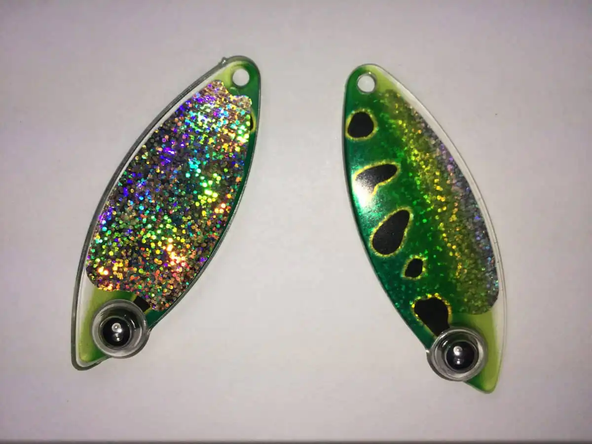 These Weighted Willow Blades have our Eye-Fish Green Frog front design and Gold colored backing. They come in a package of 3 along with 3 #2 Folded clevis’s.