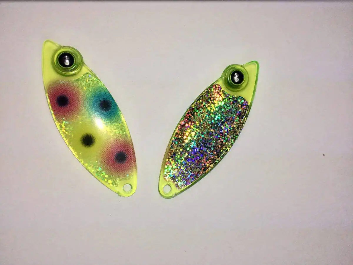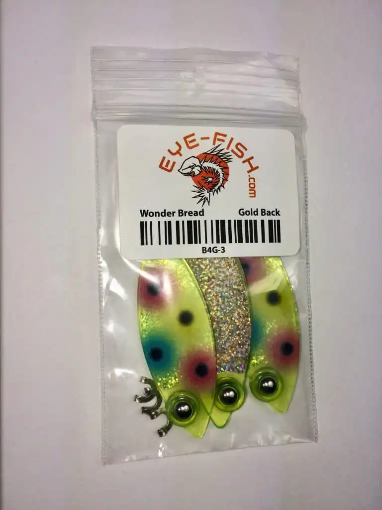 These Weighted Willow Blades have our Eye-Fish Wonder Bread front design and Gold colored backing. They come in a package of 3 along with 3 #2 Folded clevis’s.