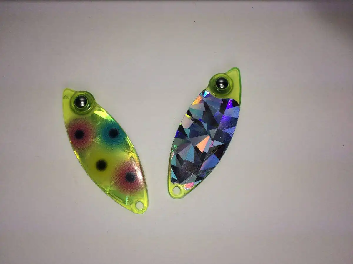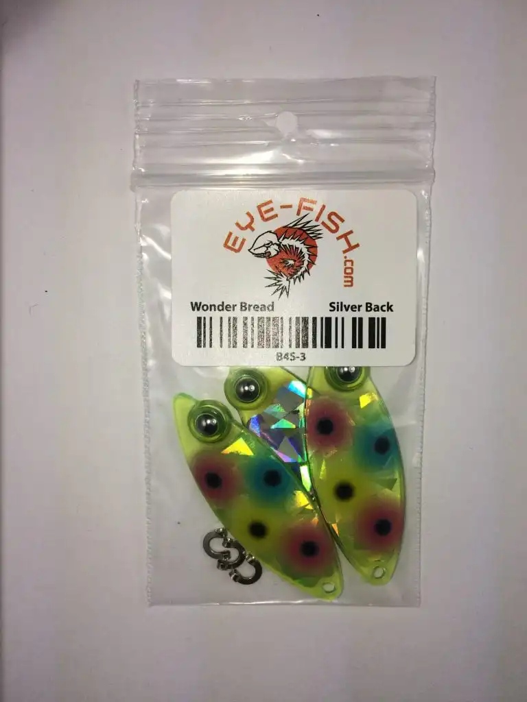 These Weighted Willow Blades have our Eye-Fish Wonder Bread front design and Silver colored backing. They come in a package of 3 along with 3 #2 Folded clevis’s.