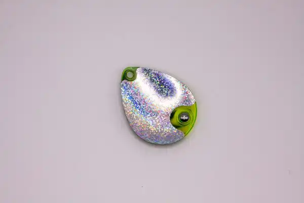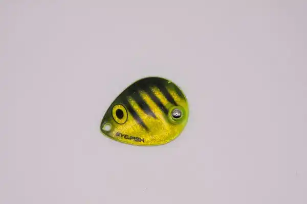 This weighted colorado single-blade harness is colored on the front with our Eye-Fish Bee design with holographic crushed silver on the backside, connected with a folded clevis to a 30lb nylon coated stainless wire featuring yellow and black beads. This is a High UV blade.
