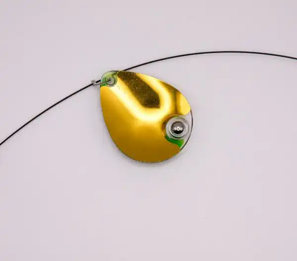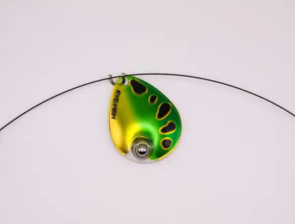 This weighted colorado single-blade harness is colored on the front with our Eye-Fish Green Frog design with holographic gold on the backside, connected with a folded clevis to a 30lb nylon coated stainless wire featuring dark green, light green, and glow beads.