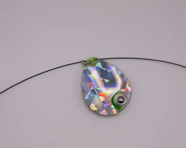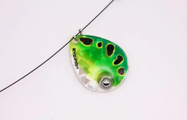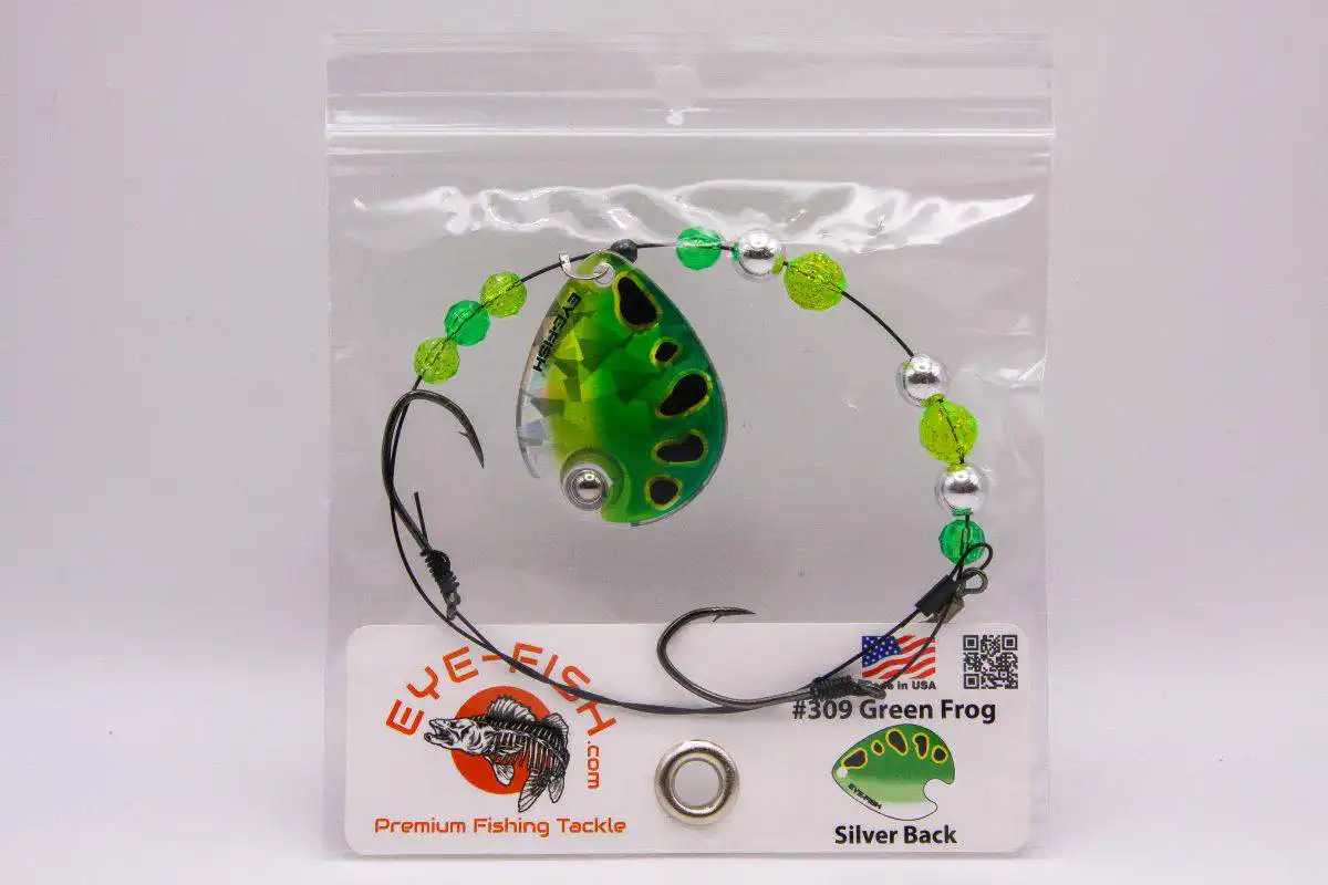 This weighted colorado single-blade harness is colored on the front with our Eye-Fish Green Frog design with holographic shattered glass on the backside, connected with a folded clevis to a 30lb nylon coated stainless wire featuring dark green, light green, and silver beads.