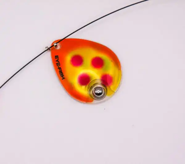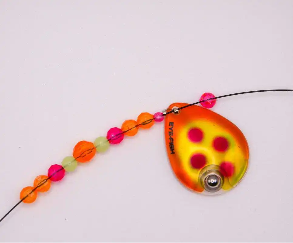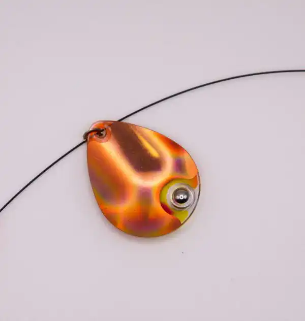 This weighted colorado single-blade harness is colored on the front with our Eye-Fish Sun Spot design with holographic copper on the backside, connected with a folded clevis to a 30lb nylon coated stainless wire featuring orange, pink, and glow beads