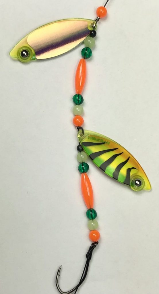 This weighted willow double blade harness lure is colored on the front with our Eye-Fish Fire Tiger design with holographic Copper on the back side and connected with a folded clevis to SS nylon coated wire line featuring neon orange, chartruese, green and glow beads.