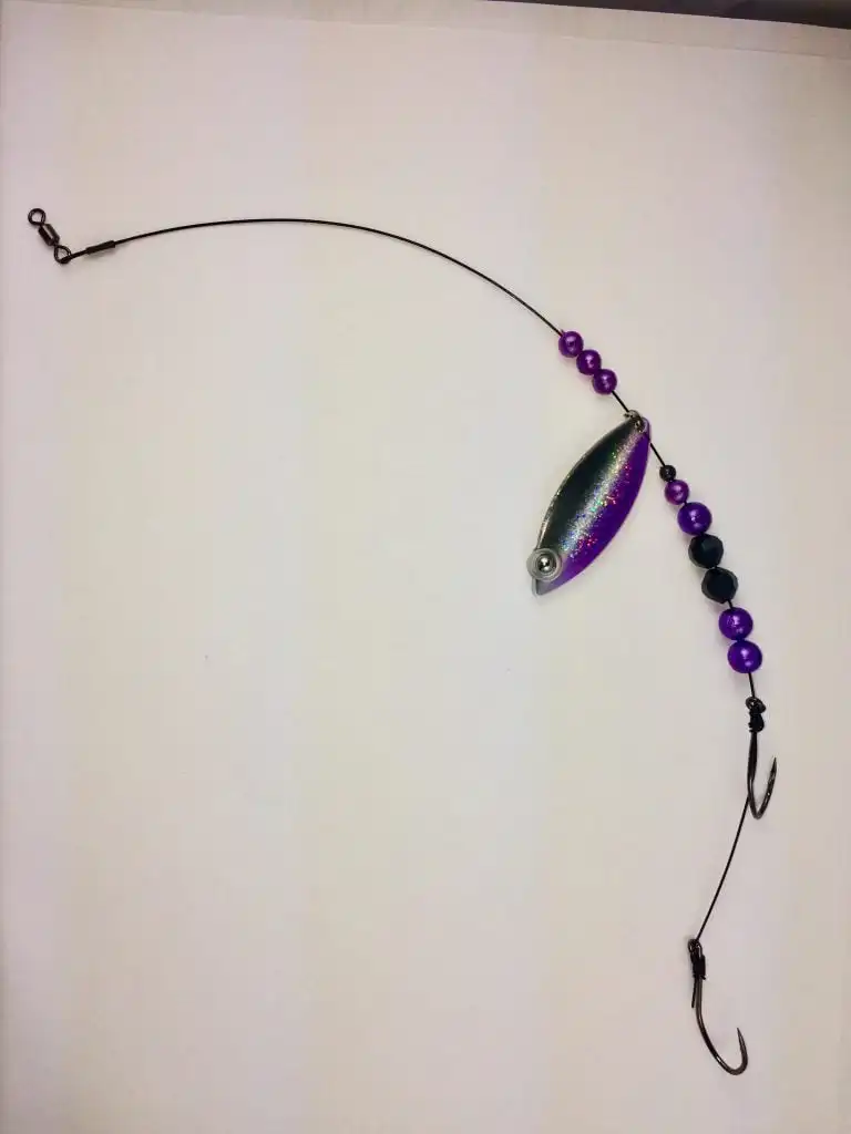This weighted willow double blade harness lure is colored on the front with our Eye-Fish Iris design with a Gold Crush design on the back side, connected with a folded clevis to a wire line featuring black and purple beads.