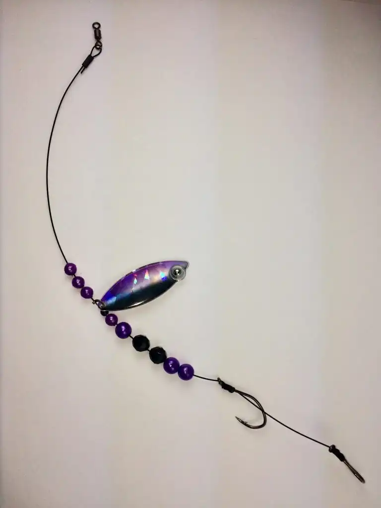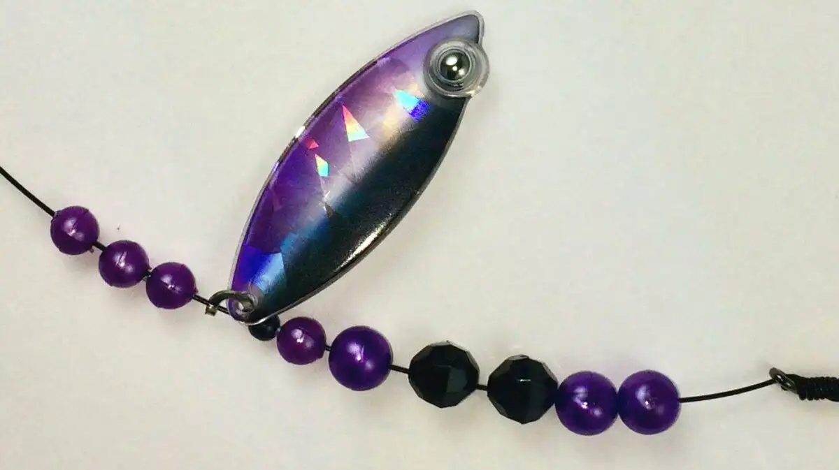 This weighted willow *single* blade harness lure *features Glow and* is colored on the front with our Eye-Fish Iris design with a Shattered Glass design on the back side, connected with a folded clevis to a wire line featuring black and purple beads.