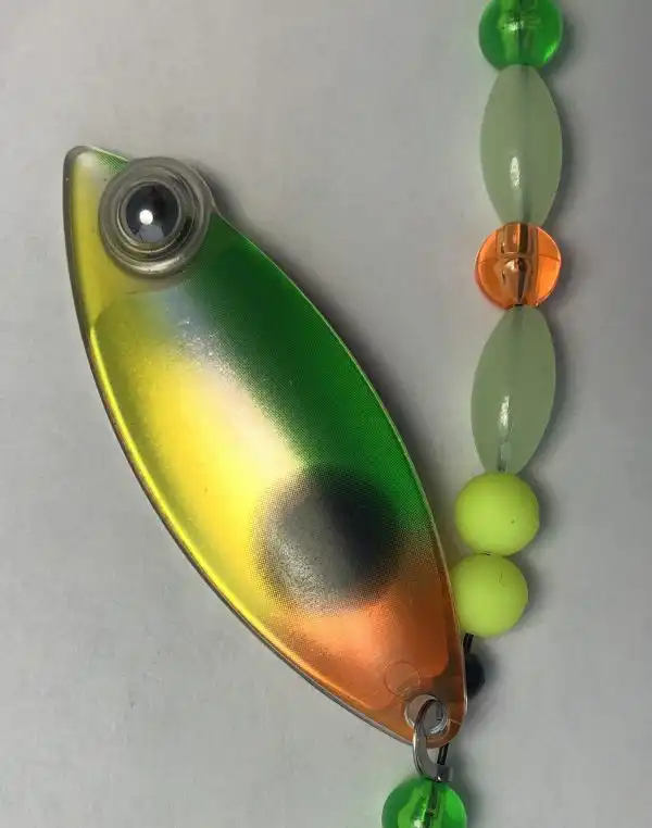 This Weighted Willow double blade harness is colored on the front with our Eye-Fish Mixed Veggie design with holographic copper color on the back side, connected with a folded clevis to a 30 lb nylon coated stainless wire featuring orange,yellow and green beads.