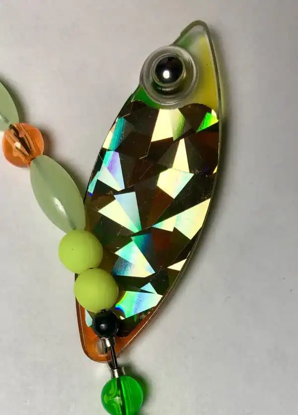 This Weighted Willow double blade harness is colored on the front with our Eye-Fish Mixed Veggie design with holographic gold color on the back side, connected with a folded clevis to a 30 lb nylon coated stainless wire featuring orange,yellow,green and glow beads.