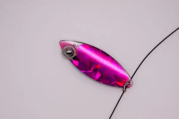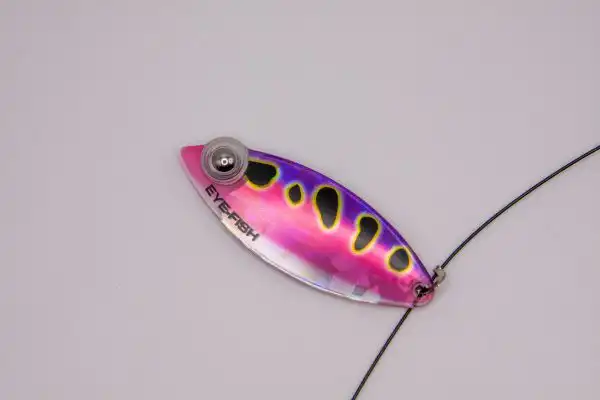 This Weighted Willow Double blade harness is colored on the front with our Eye-Fish Pink Frog design with holographic shattered glass raspberry color on the backside, connected with a folded clevis to a 30lb nylon coated stainless wire featuring pink, purple, and glow beads.