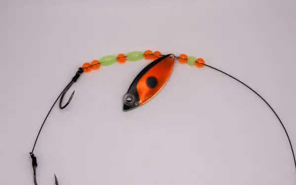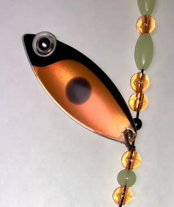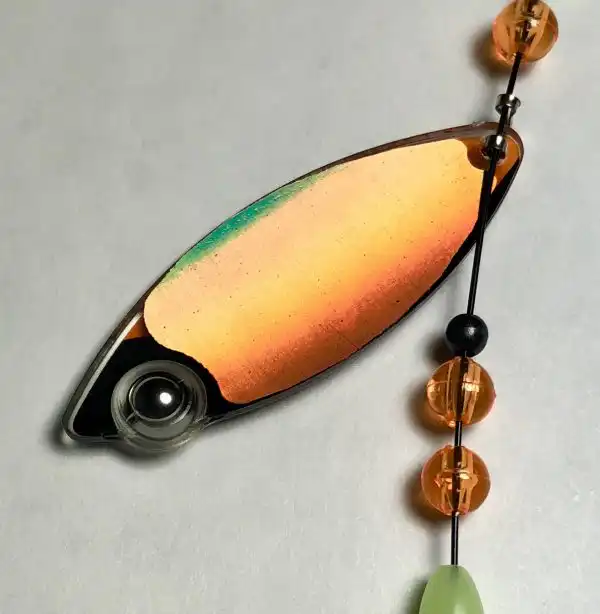 This Weighted Willow single blade harness is colored on the front with our Eye-Fish Darter design with holographic copper color on the backside, connected with a folded clevis to a 30lb nylon coated stainless wire featuring orange, black, and glow beads.