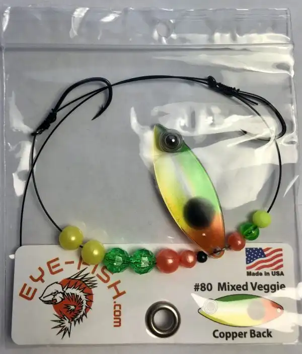 This Weighted Willow single blade harness is colored on the front with our Eye-Fish Mixed Veggie design with holographic copper color on the back side, connected with a folded clevis to a 30 lb nylon coated stainless wire featuring orange,yellow and green beads.