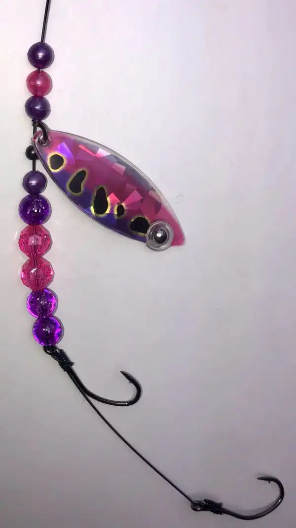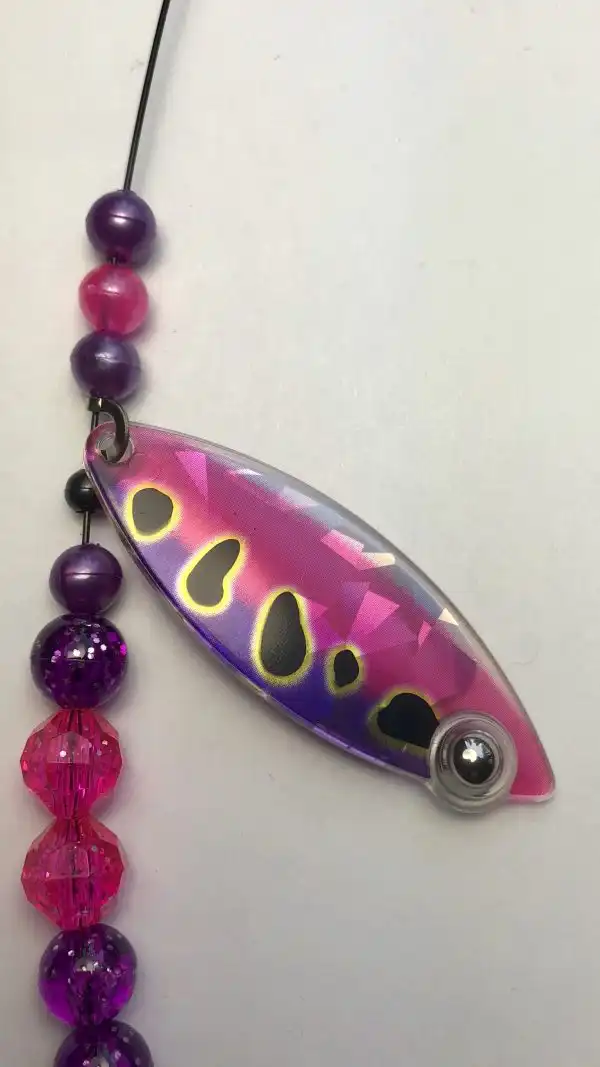 This Weighted Willow Single blade harness is colored on the front with our Eye-Fish Pink Frog design with holographic Raspberry color on the back side, connected with a folded clevis to a 30 lb nylon coated stainless wire featuring pink and purple beads.