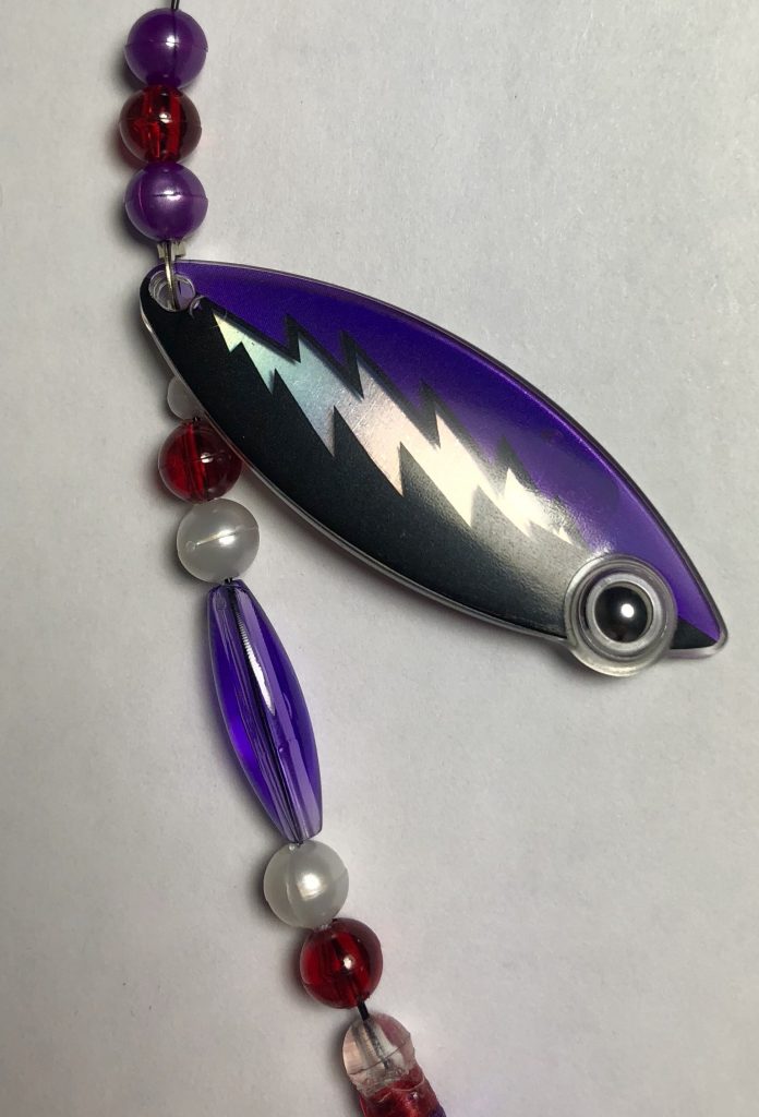This Weighted Willow single blade harness is colored on the front with our Eye-Fish Steal Your Fish design with holographic copper color on the back side, connected with a folded clevis to a 30 lb nylon coated stainless wire featuring purple,red and white beads with a purple/silver Eye Fly.