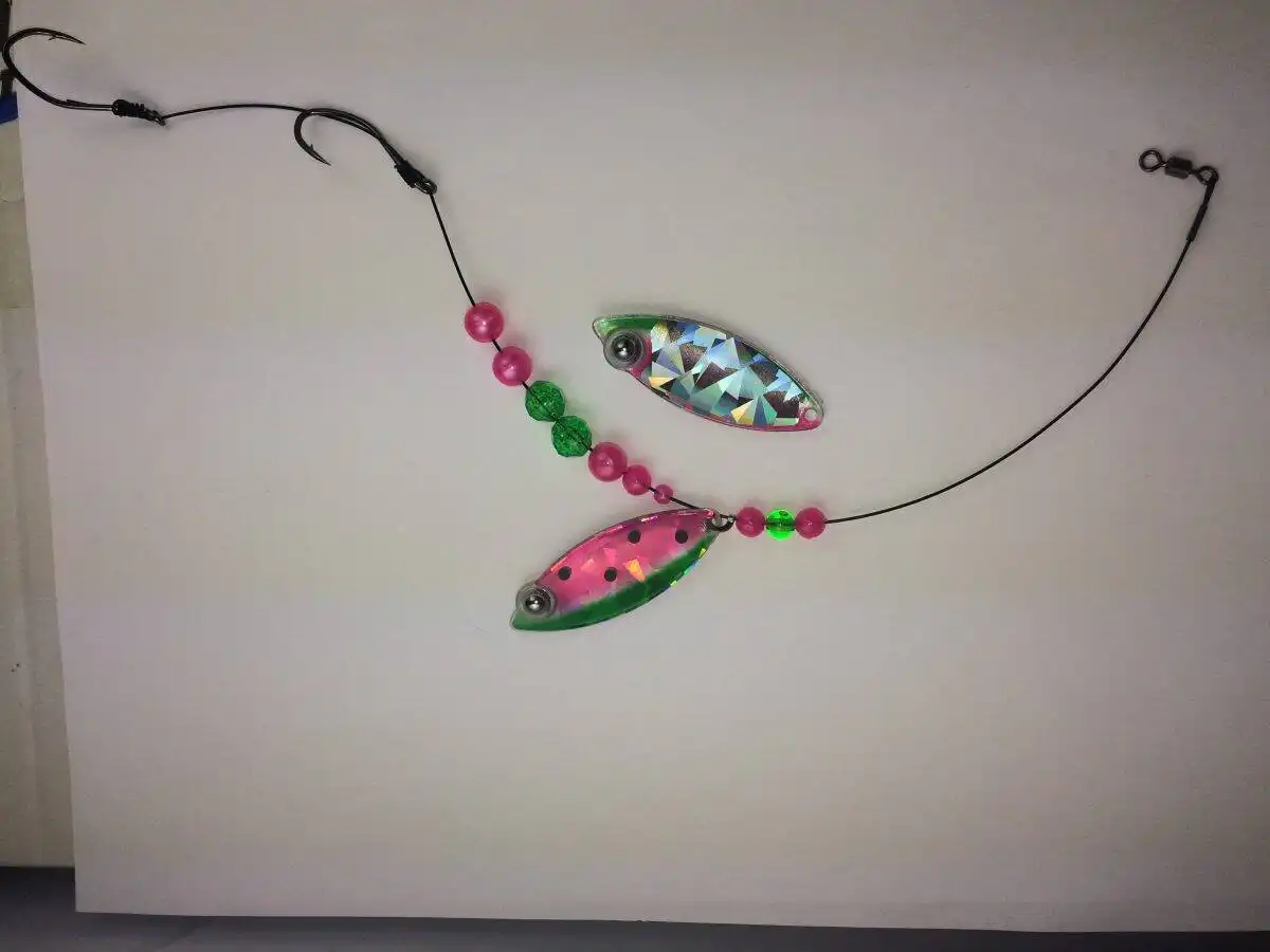 This weighted willow single blade harness lure is colored on the front with our Eye-Fish Watermelon design with a Shattered Glass pattern on the back side, connected with a folded clevis to a wire line featuring pink and green beads.