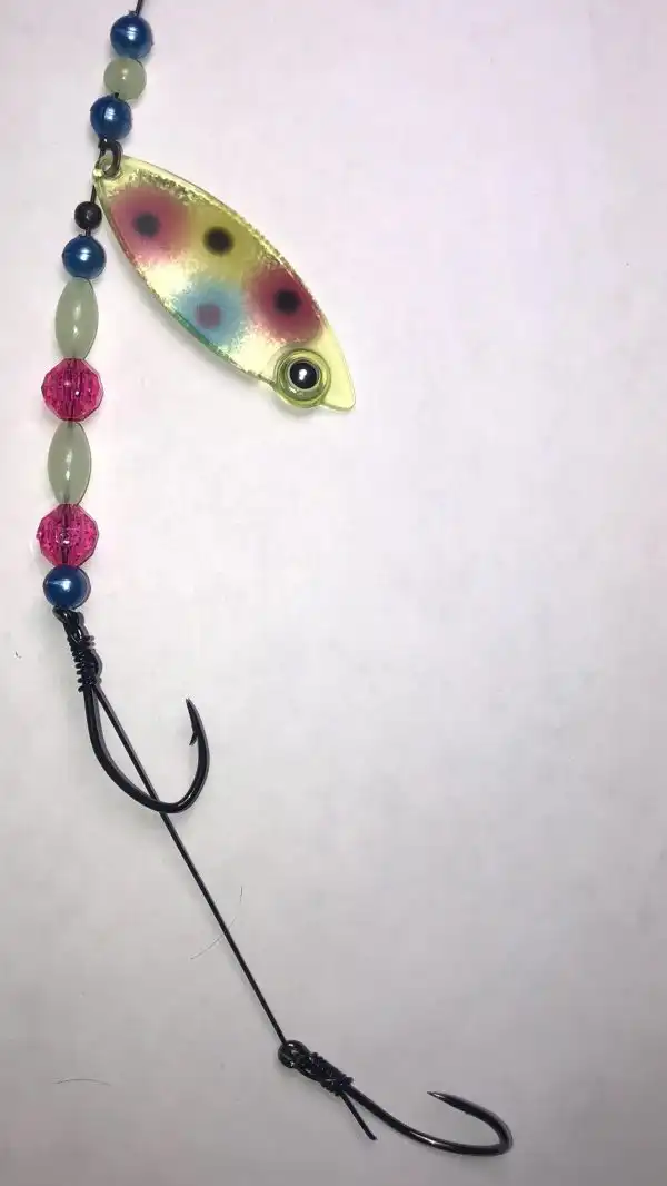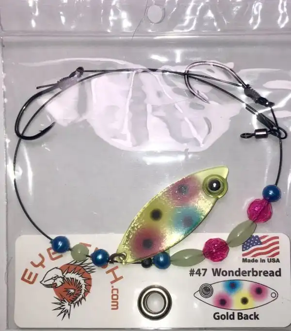 This weighted willow single blade harness lure features Glow, and is colored on the front with our Eye-Fish Wonder Bread design with gold color on the back side, connected with a folded clevis to a wire featuring pink, yellow and blue beads.