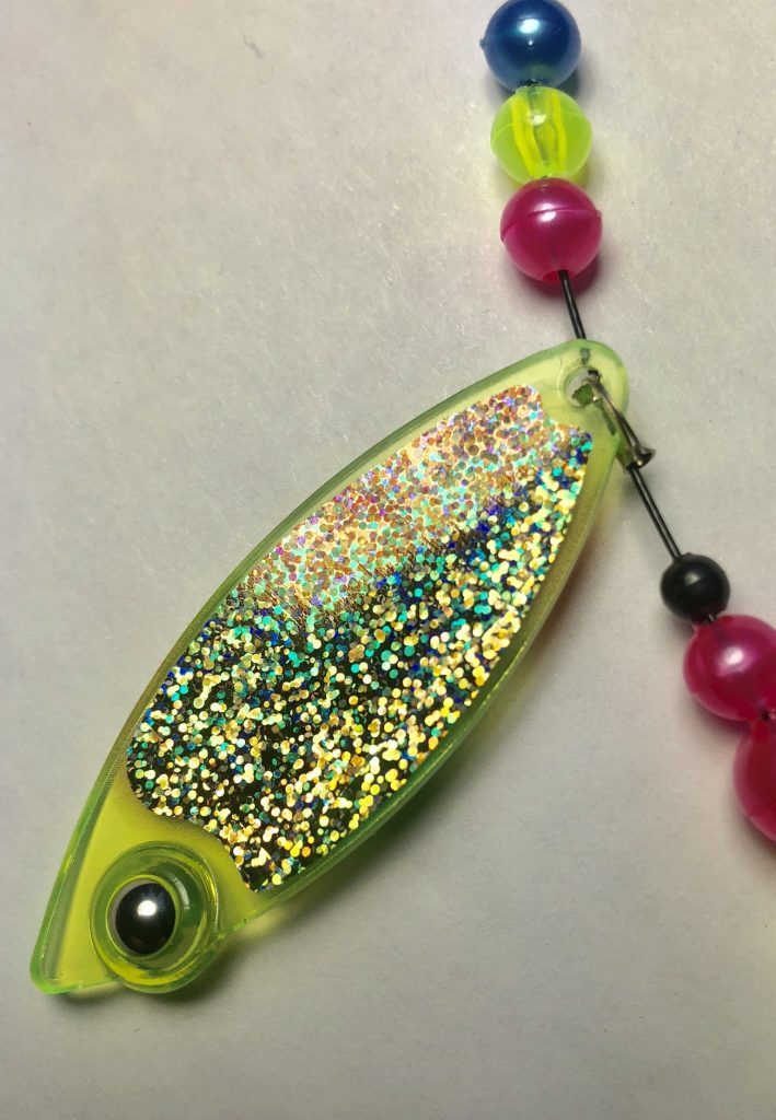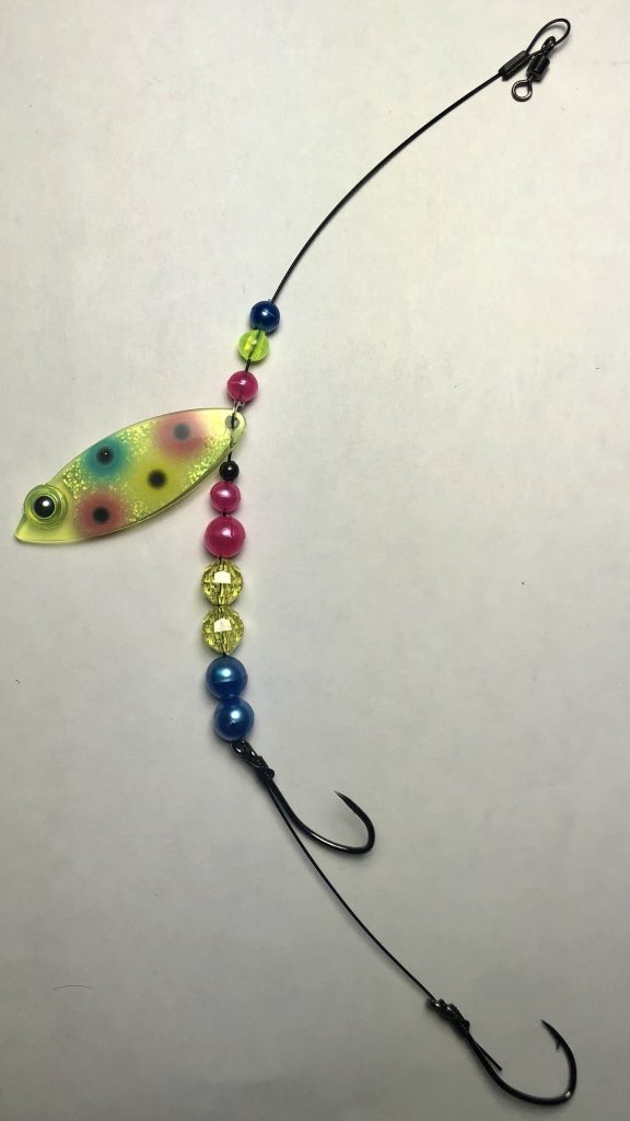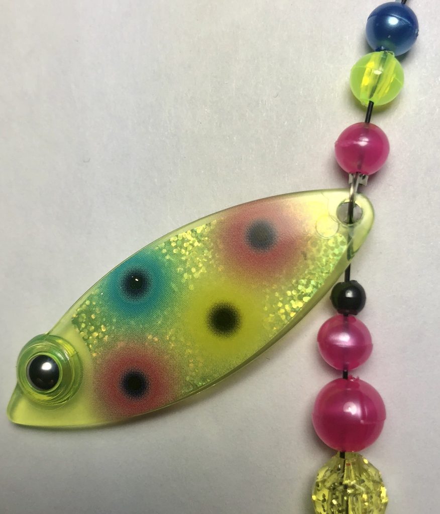 This weighted willow single blade harness lure is colored on the front with our Eye-Fish Wonder Bread design with Gold color on the back side, connected with a folded clevis to a wire line featuring pink, yellow and blue beads.