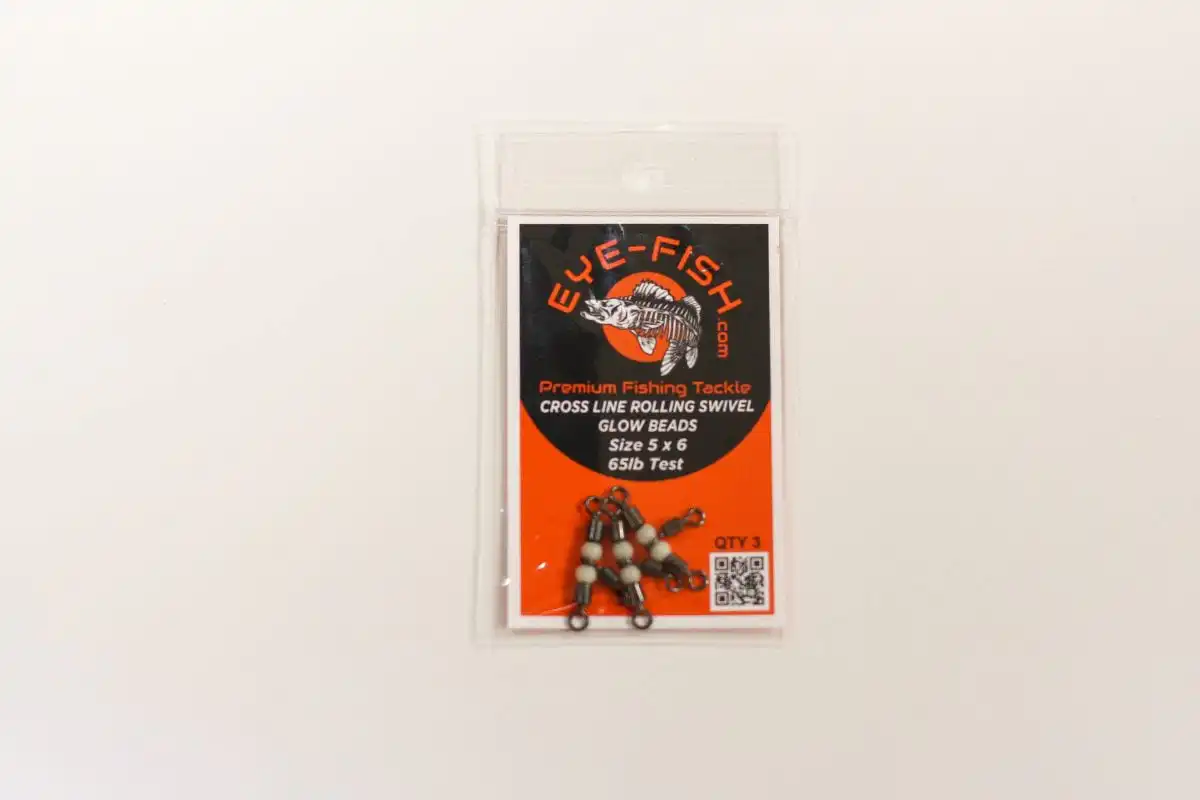 May 10, 2022 Premium Fishing Tackle by Eye-Fish 1200 × 800 Premium Fishing Tackle by Eye-Fish Durable crossline rolling swivel in packaging, perfect for enhancing fishing setups and preventing line twists. This image shows a package of Eye-Fish premium fishing tackle, featuring a crossline rolling swivel with 65lb test, designed for serious anglers.
